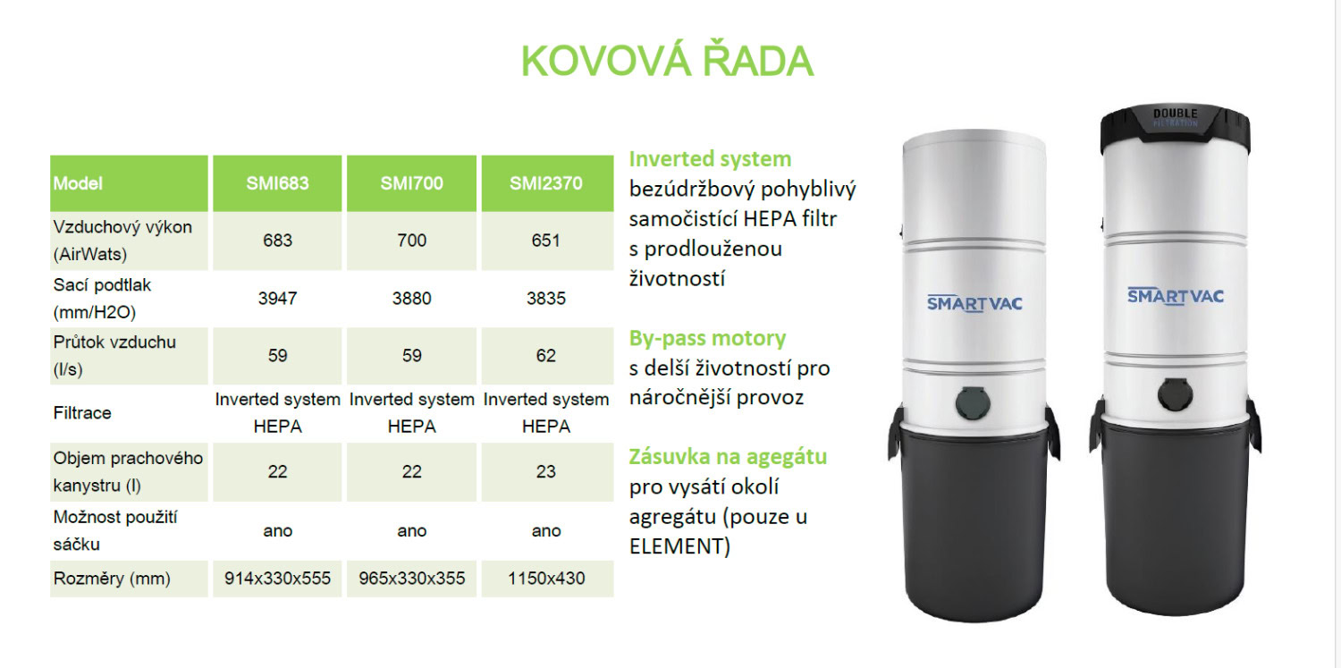Moderní způsob úklidu, zdraví. Zcela zabudovaný vysávací systém, tzn. vysavačová jednotka, vysávací hadice.