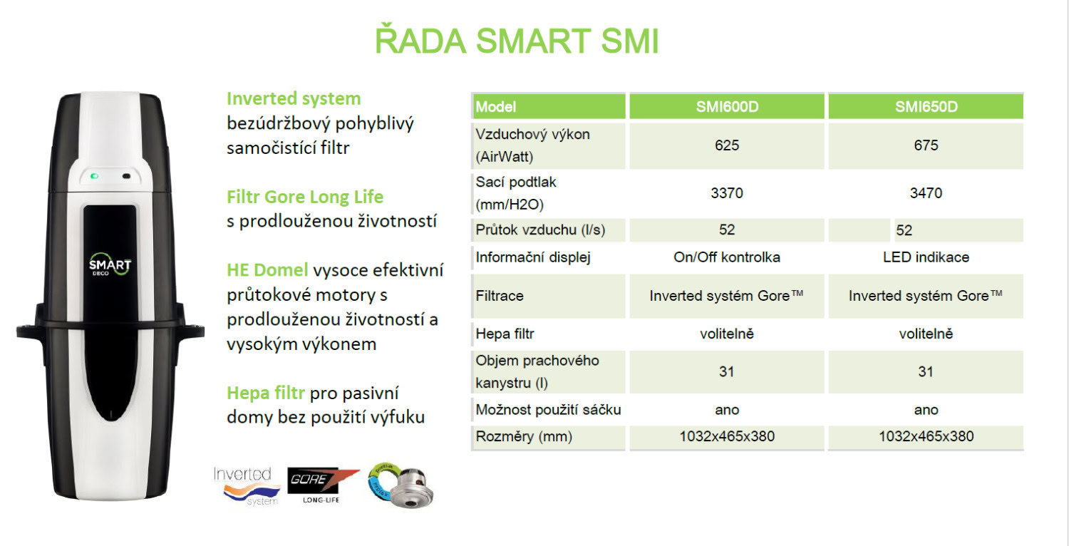 První integrovaný vysavač pro byty, malé rozměry. Vysoký sací výkon, odtah mimo objekt.